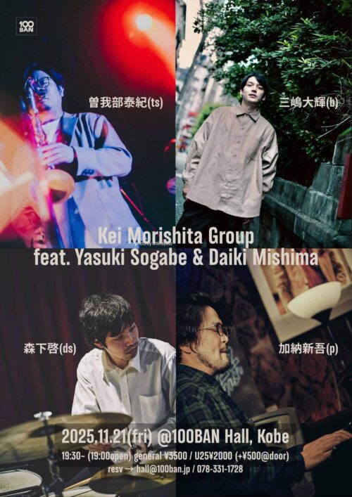 森下啓(ドラムス) 曽我部泰樹(サックス) 三嶋大輝(ベース) 加納新吾(ピアノ)