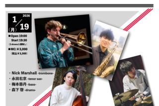 Nick Marshall(トロンボーン) 永田右京(テナーサックス) 梅本慈丹(ベース)森下啓(ドラムス)